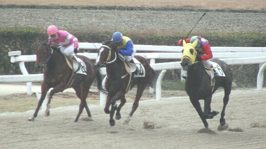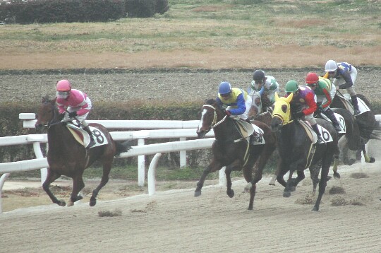 最内のサイキョウキロク号が脱落しかかったところにオグリデューク号が大外から加わって激しい追い比べに。